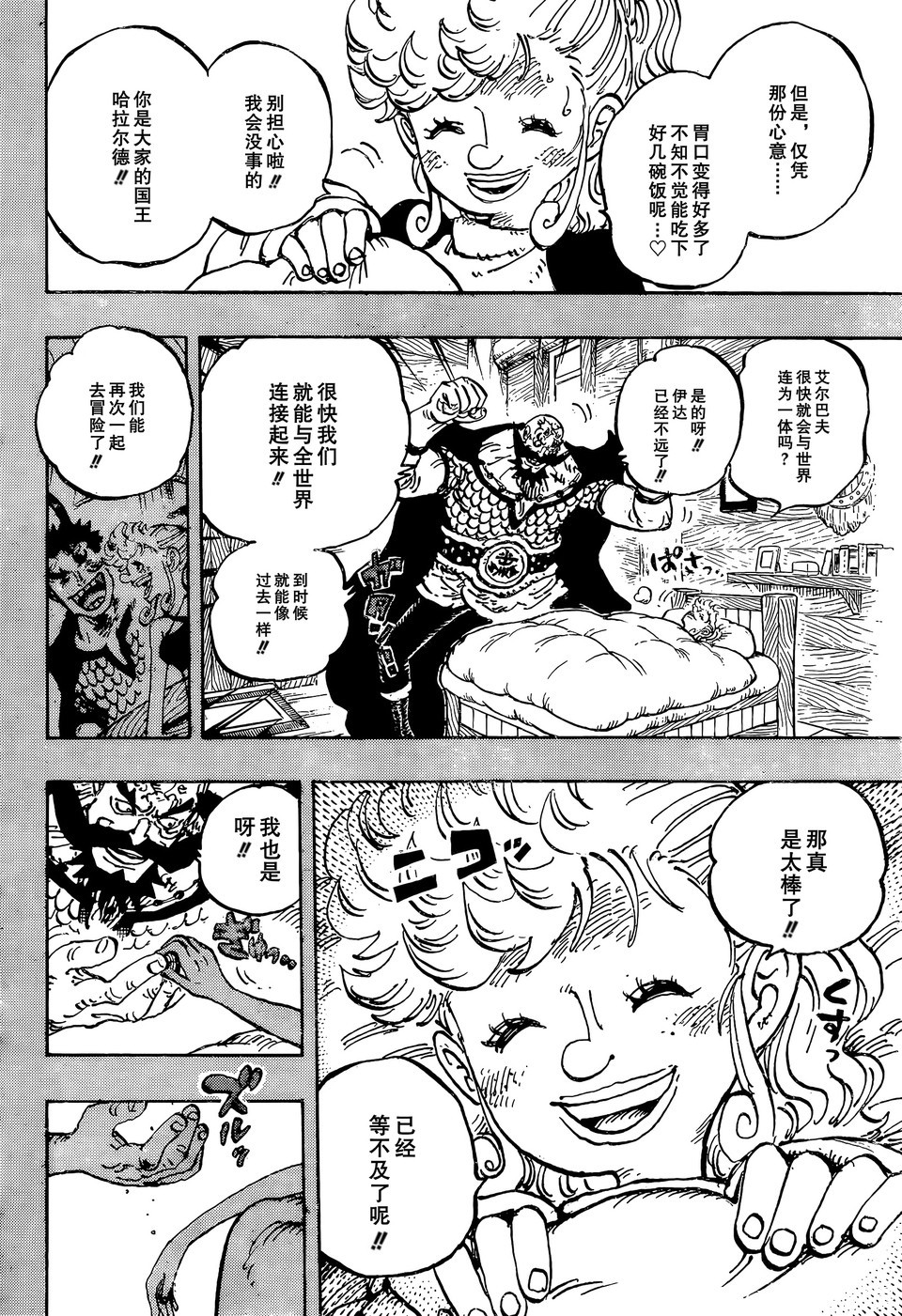 草帽一伙终于要开启了新的冒险,刚经历了未来岛大战,他们就来到艾尔巴夫冒险。草帽一伙参观学校和图书馆,罗宾见到萨乌罗,她非常激动,跟萨乌罗痛哭流涕。罗宾和乔巴留在图书馆看书,莉莉丝和波妮找到废弃的实验室,她们打算留在这里生活。